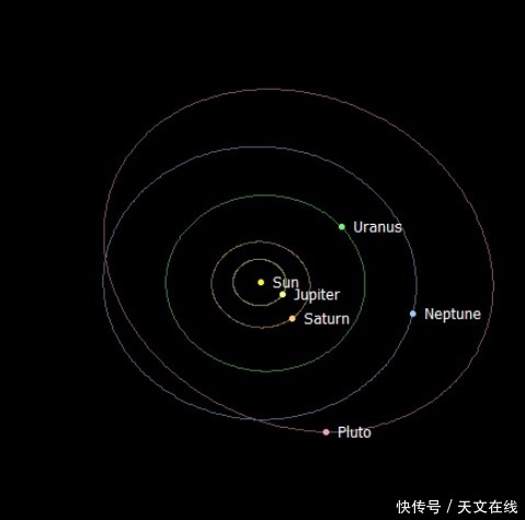 图解:太阳系轨道图,包括冥王星的椭圆轨道。这幅太阳系图表明了在2021年10月冥王星的位置。冥王星在1979~1999年比海王星离太阳更近。但是随着它在椭圆轨道上移动的更远,它现在正在进入更寒冷的阶段。图源Cybersky。