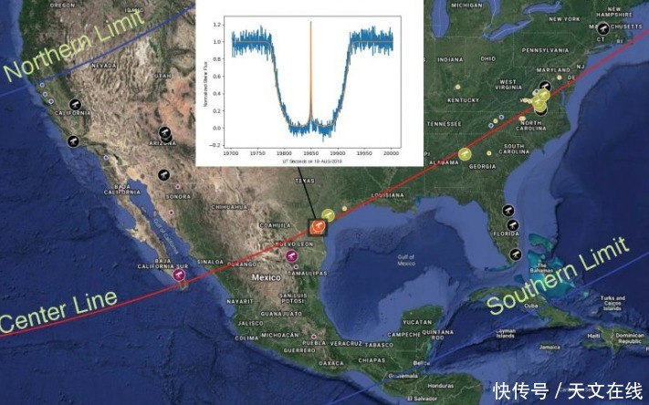 这是冥王星掩星路径横跨墨西哥,路易斯安那和美国东北部的插图。
